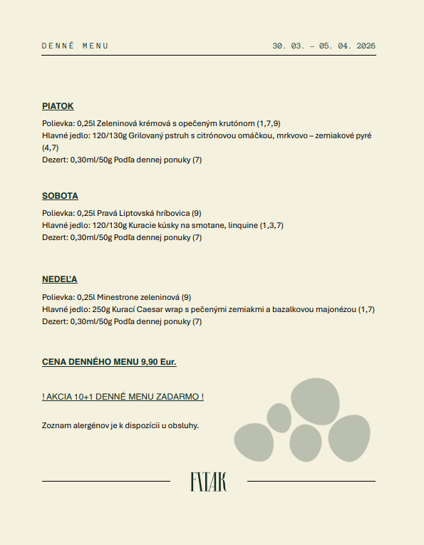 Doprajte si príjemnú obedovú pauzu v pokojnom prostredí nášho hotela a vychutnajte si trojchodové denné menu pripravované z čerstvých a kvalitných surovín.