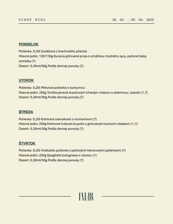 Počas celého týždňa pre vás každý deň varíme poctivo a s dôrazom na vyvážené chute, aby bol váš obed malým každodenným potešením — či už prichádzate na pracovné stretnutie alebo len načerpať energiu.
