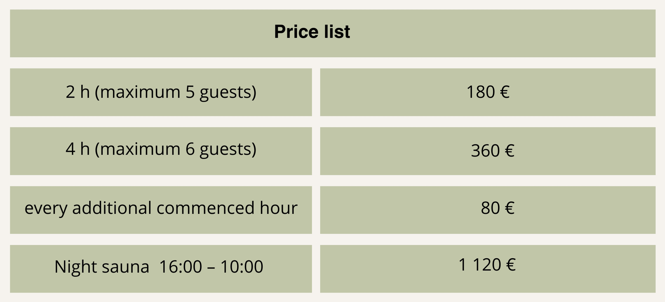 - for night sauna sessions: free accommodation with breakfast at the hotel (advance reservation required)
