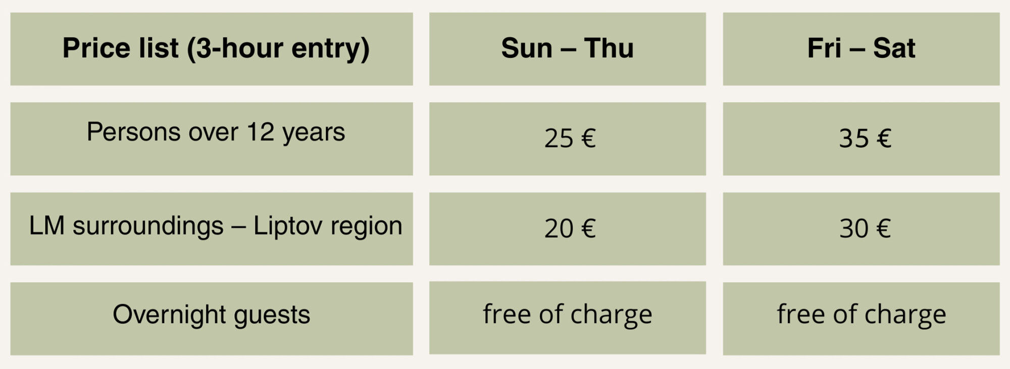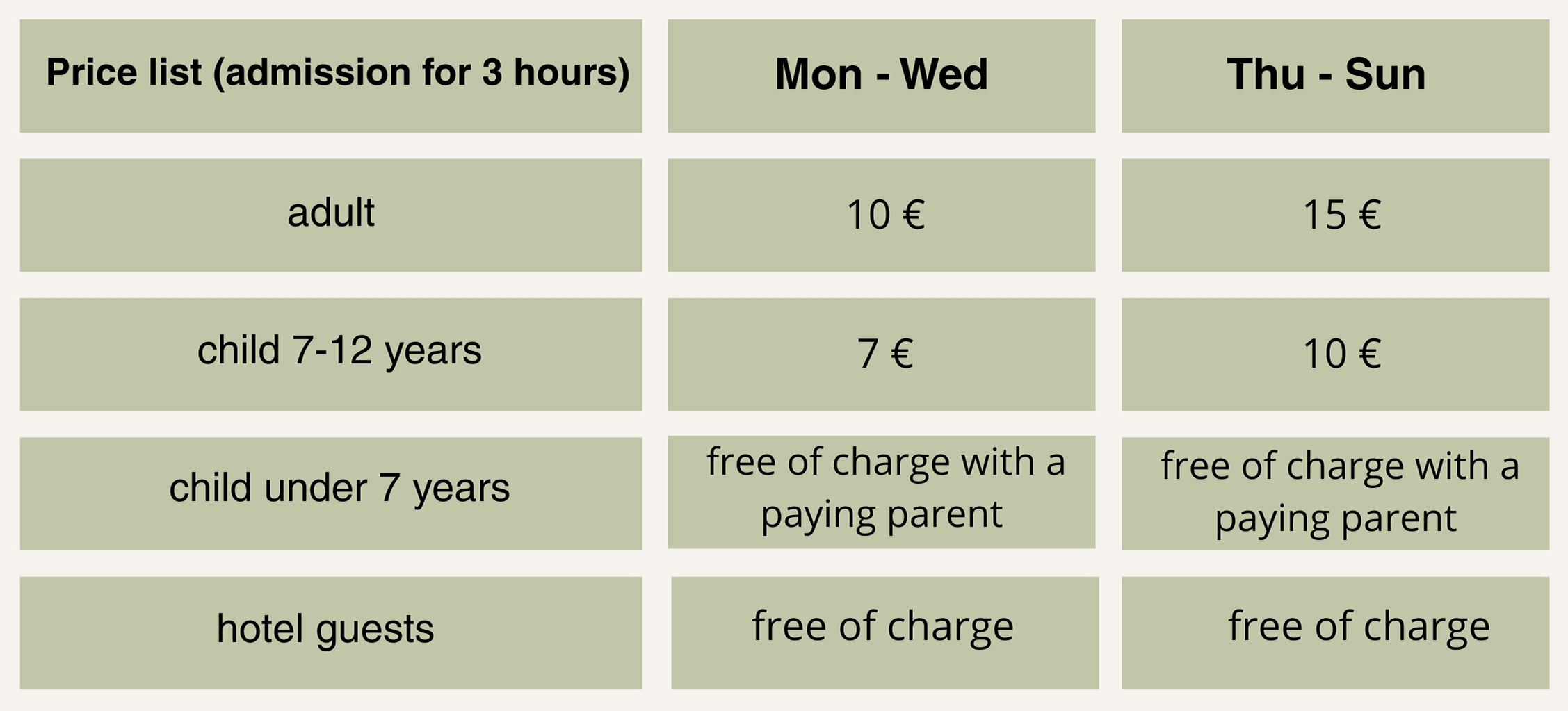 Steam aroma sauna 45°, Salt sauna 45°, Hammam 45°, Finnish sauna 100°, Swedish bio sauna 65°, Cooling pool, Finnish bucket 10°, Shower - tropical rain, Icefall, Jacuzzi 35°, Tepidarium 22-24° , water relaxation path.