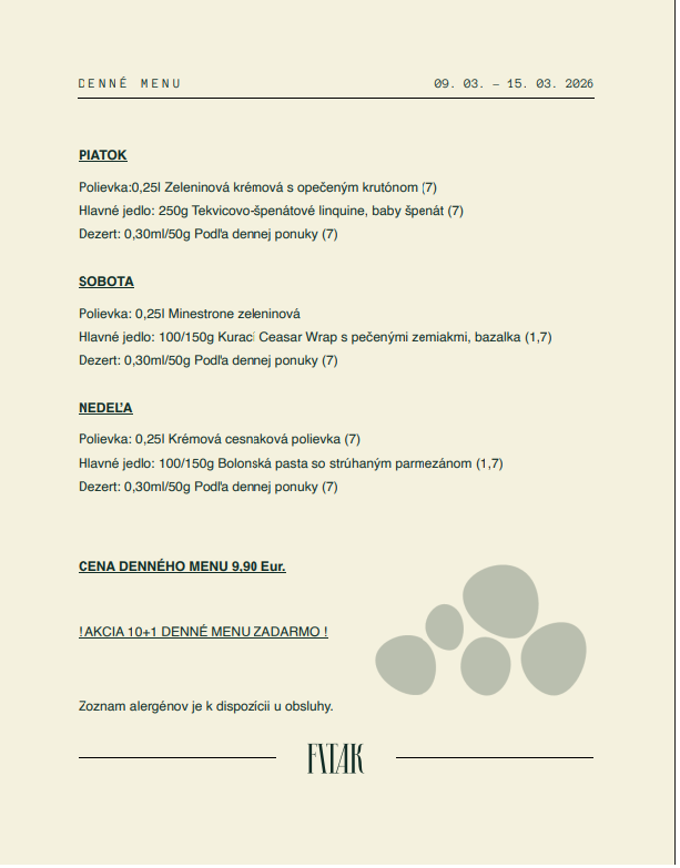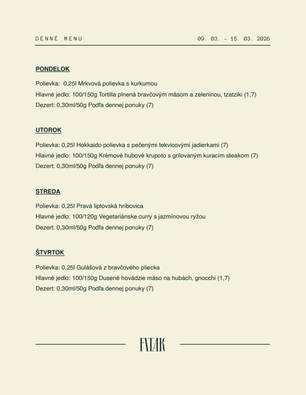 Počas celého týždňa pre vás každý deň varíme poctivo a s dôrazom na vyvážené chute, aby bol váš obed malým každodenným potešením — či už prichádzate na pracovné stretnutie alebo len načerpať energiu.